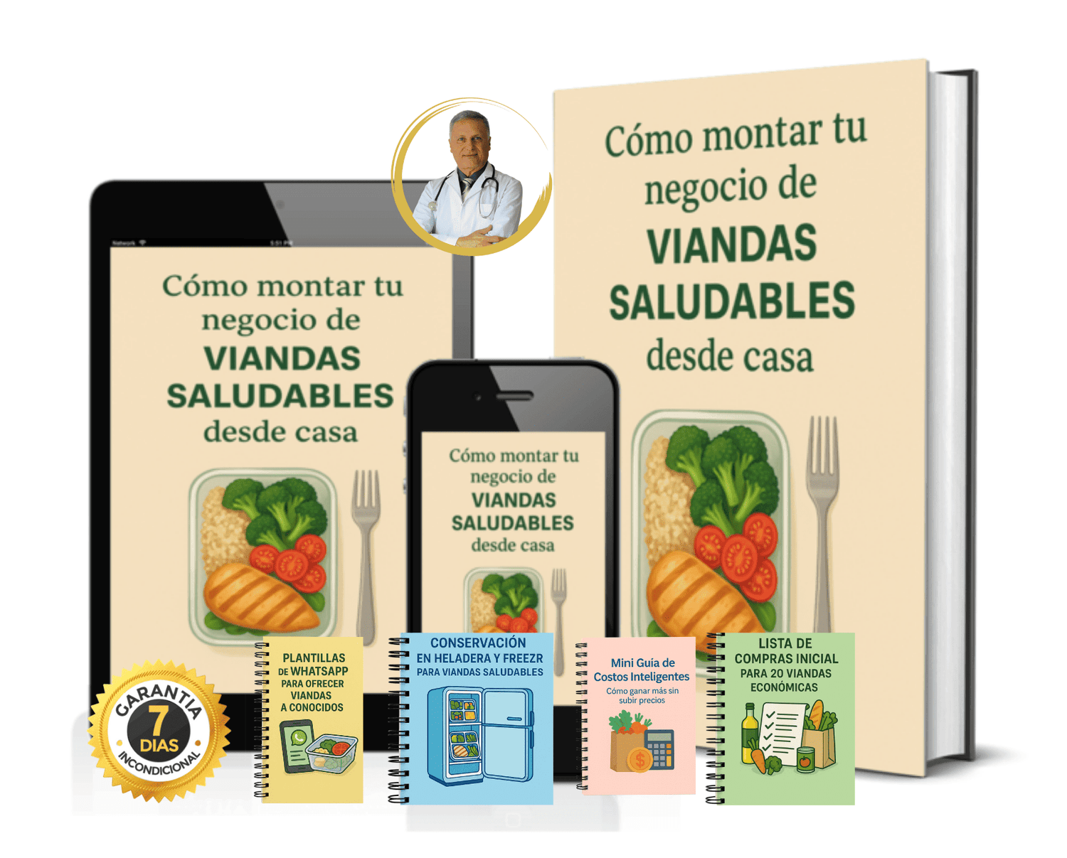 Con este manual paso a paso en eBook + 4 bonos exclusivos, tendrás todo lo que necesitas para empezar tu negocio de VIANDAS SALUDABLES con seguridad, confianza y la guía de un Médico Nutricionista con 40 años de experiencia.